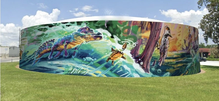 Shortly after Natural Flow was deaccessioned, Ocala Cultural Arts issued an open call for artists to create a new “flora and fauna” themed mural to cover the entire tank, which holds a million gallons of the city of Ocala’s drinking water.