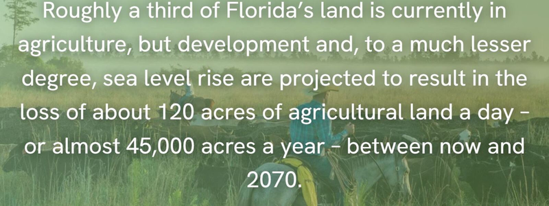 Roughly a third of Florida’s land is currently in agriculture, but development and, to a much lesser degree, sea level rise are projected to result in the loss of about 120 acres of agricultural land a day – or almost 45,000 acres a year – between now and 2070.